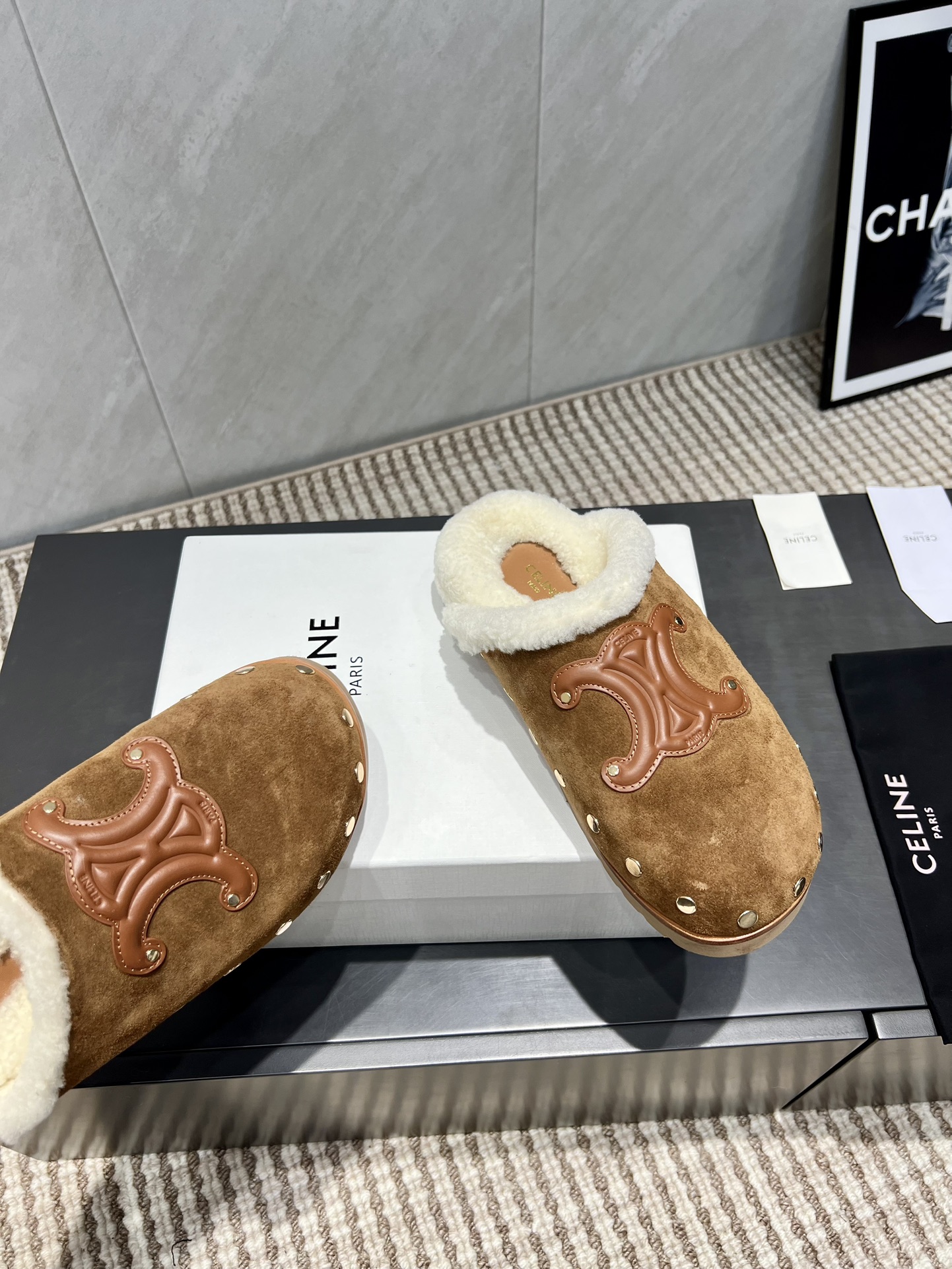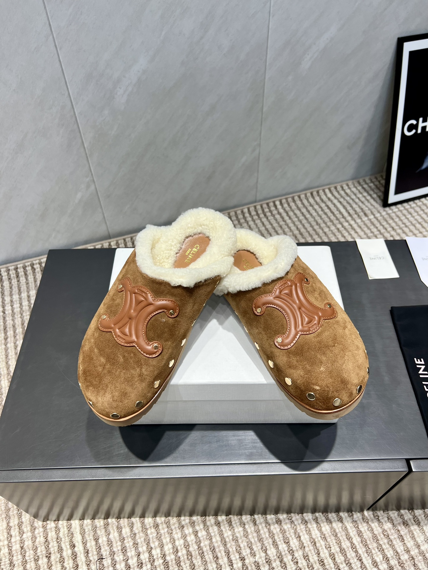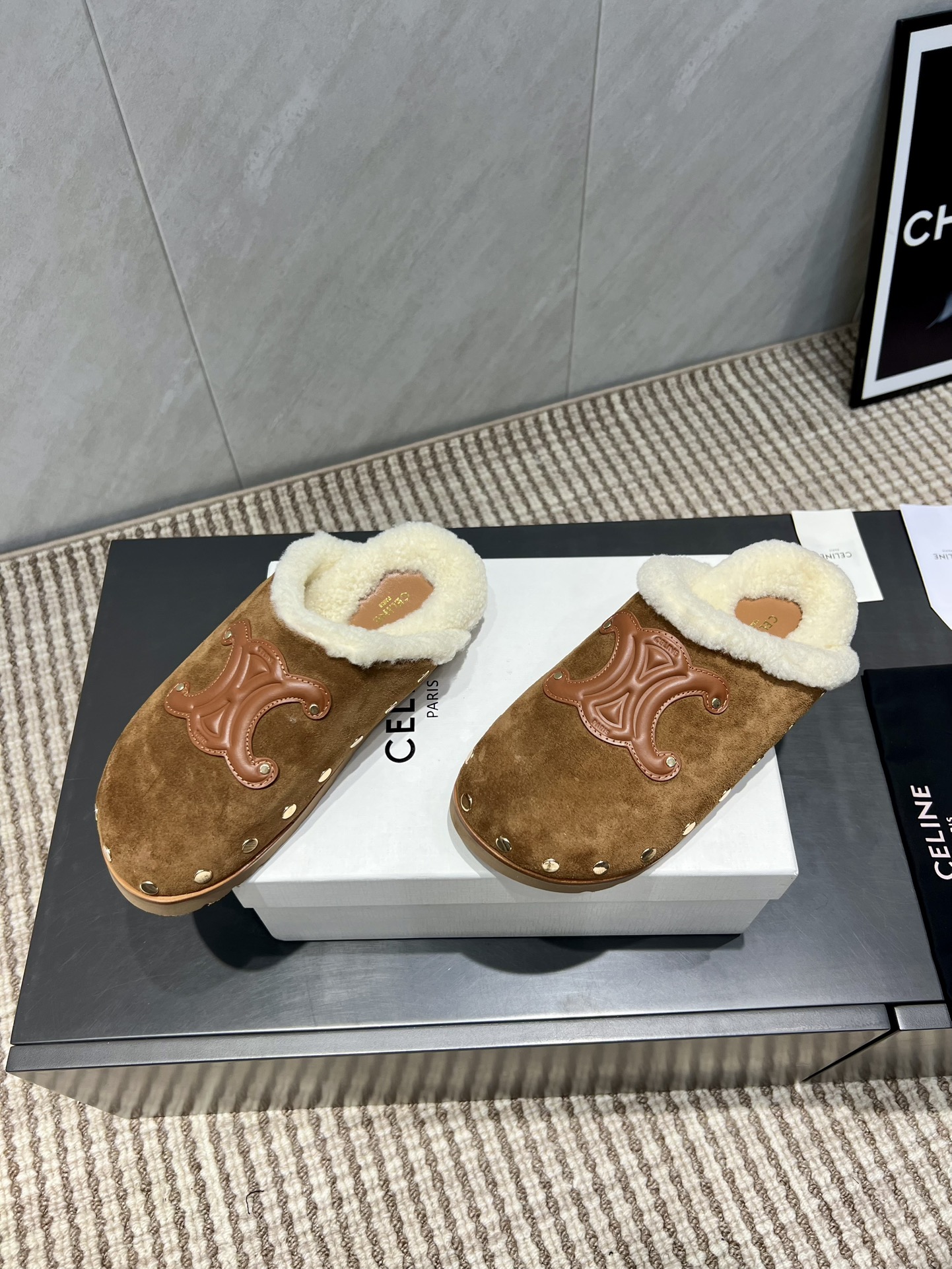 셀린느 로고 퍼 슬라이드 뮬