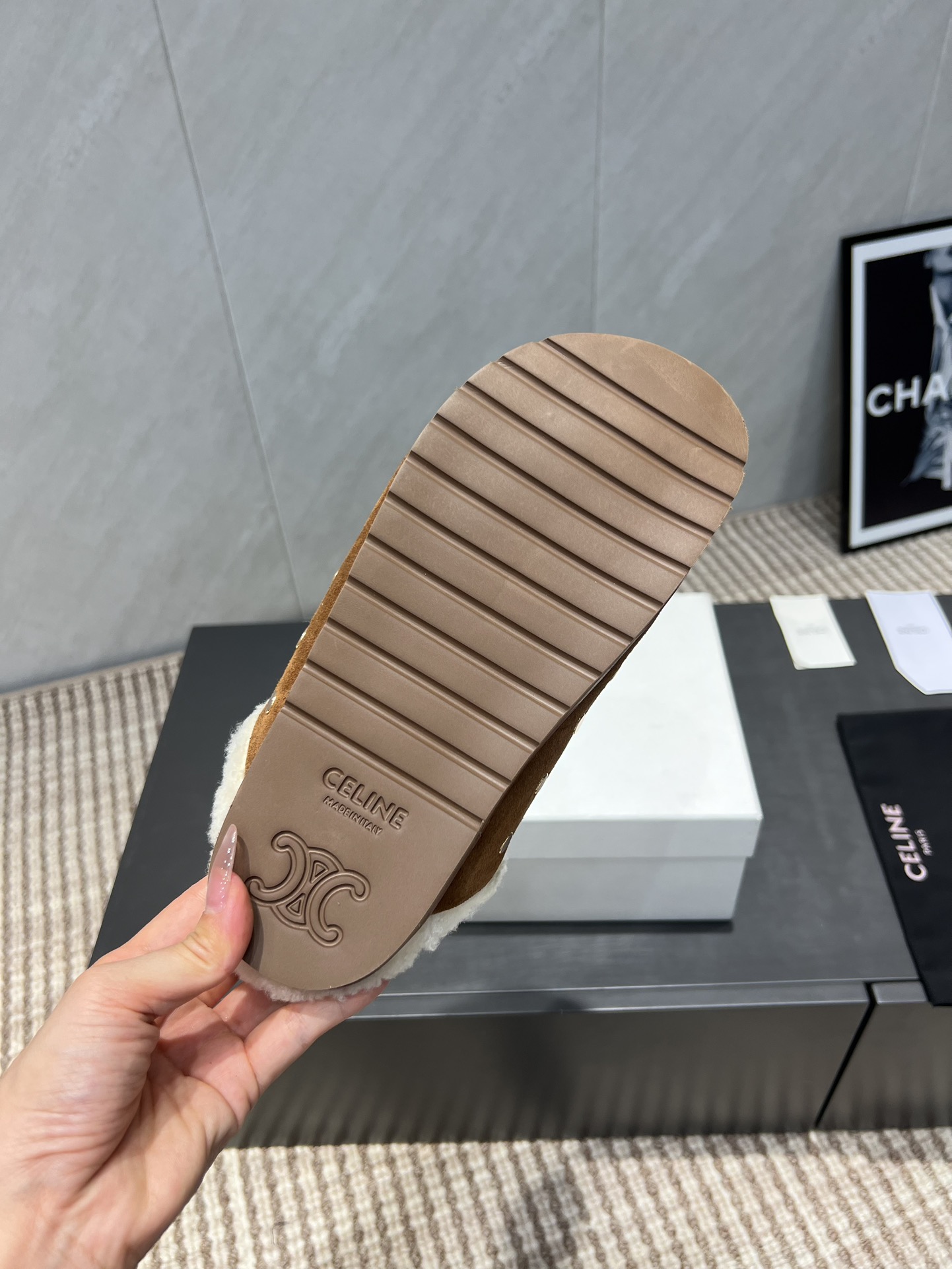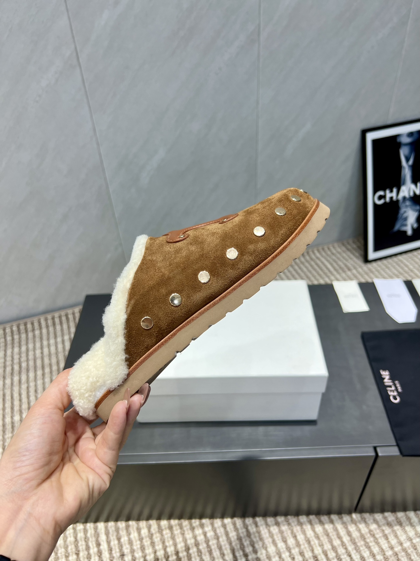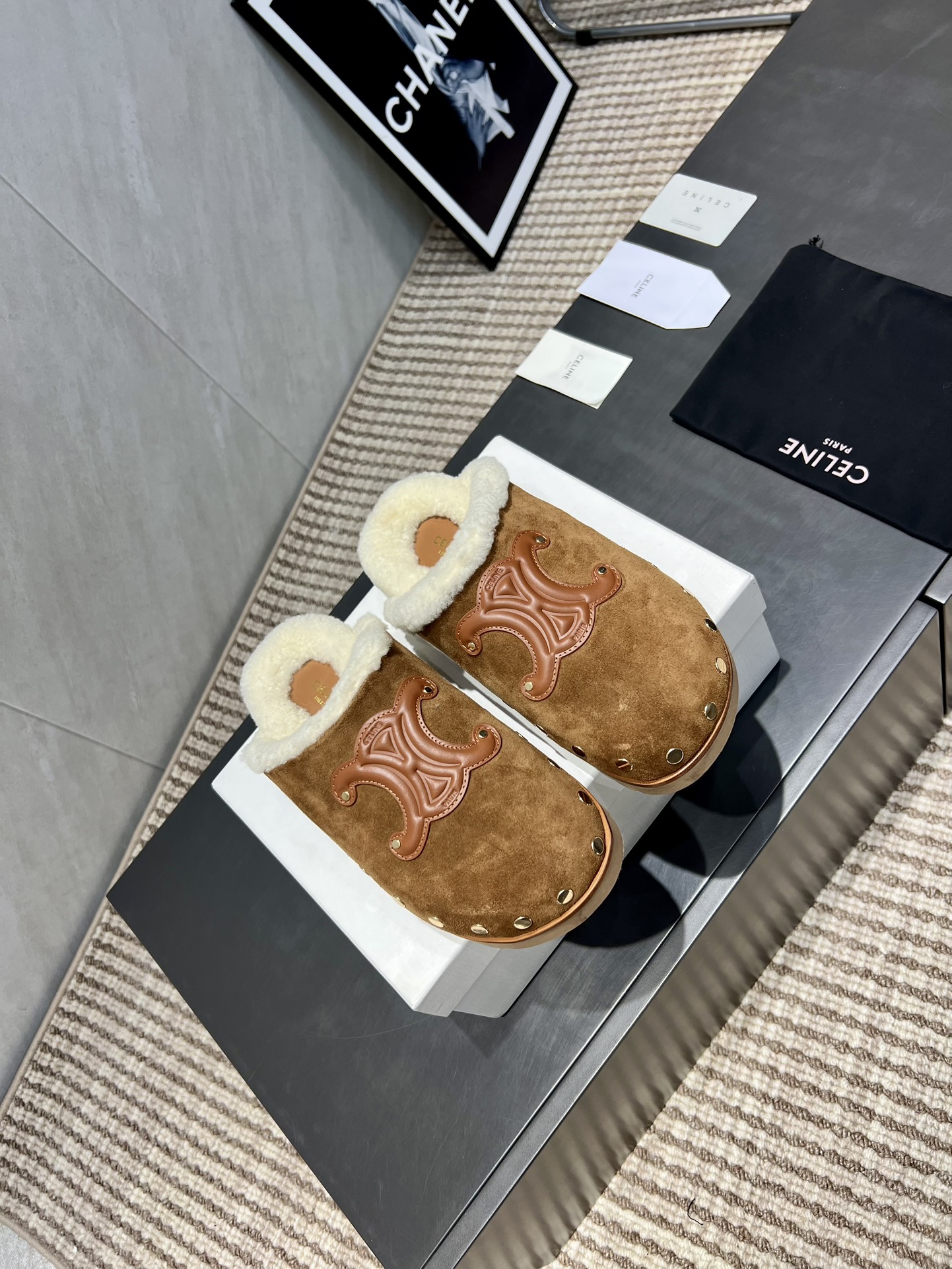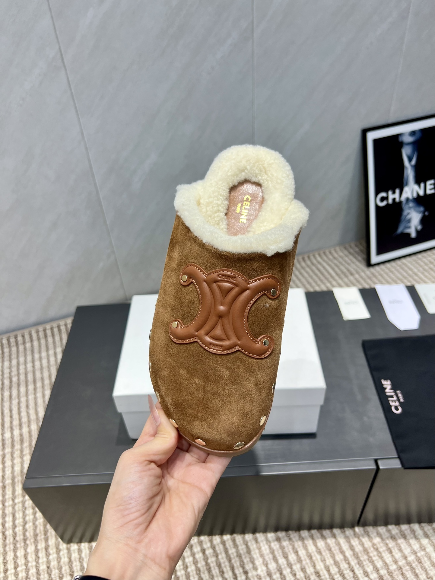 셀린느 로고 퍼 슬라이드 뮬